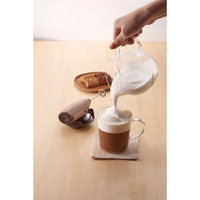 - Battery operated frothing wand and heatproof glass pitcher.